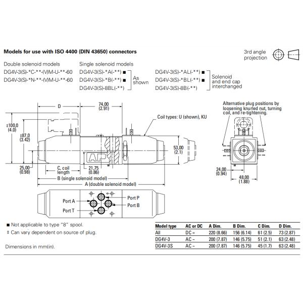 | Low power coils, “BL” and “DL”: (Not available with “N” – No-spring detented models) | Low power coils not usable with DG4V-3S valves. | 170 37 N/A | ||||||